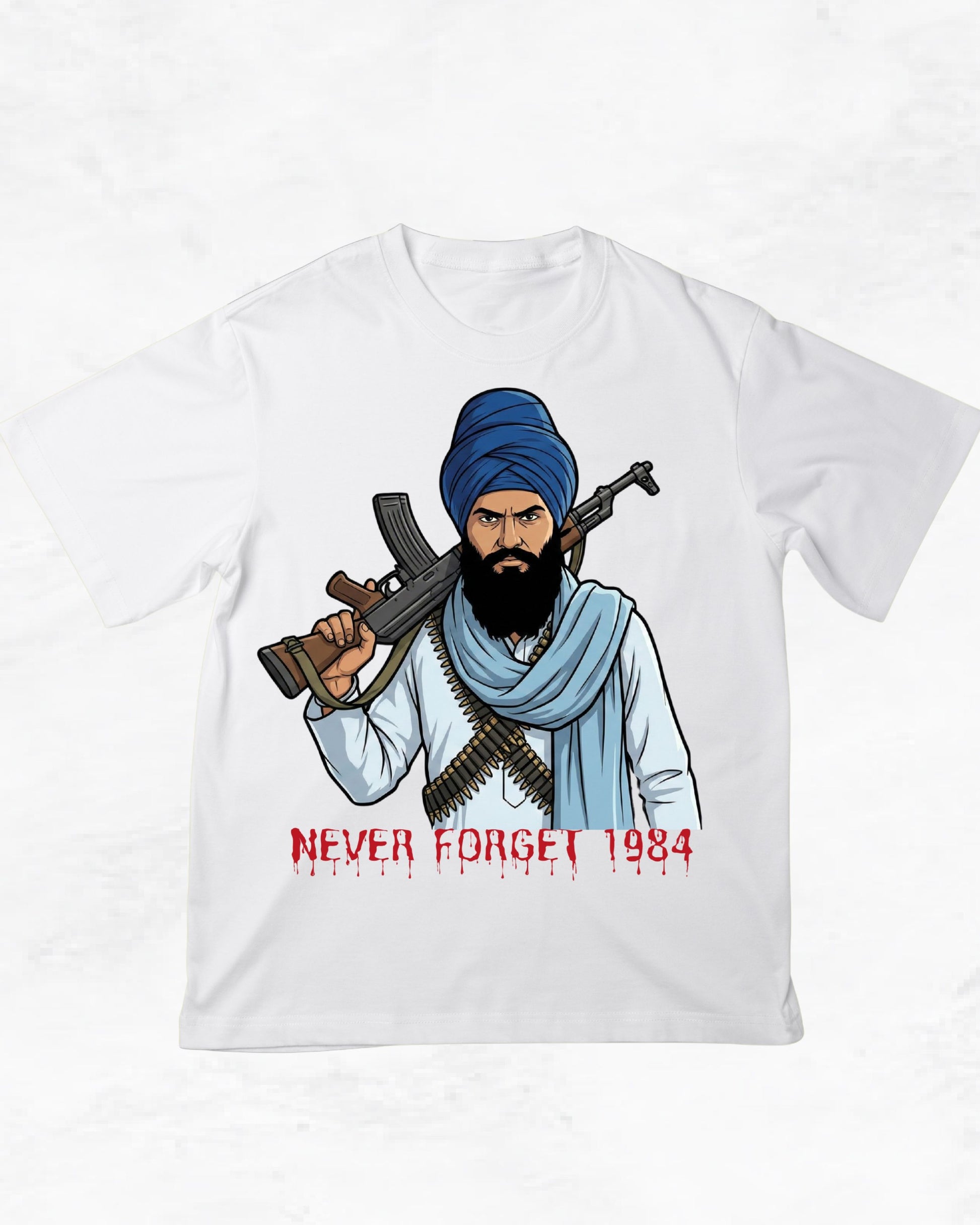Design: Features a detailed illustration of a Sikh warrior with the text "NEVER FORGET 1984" in bold red.